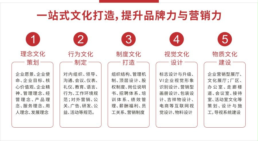 我们致力于为企业提供从理念层、行为层、制度层到物质层的一站式企业文化建设解决方案,深度打造个性化企业文化体系,提升企业品牌力与竞争力。
