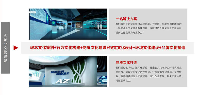 服务范围涵盖理念、行为、视觉、环境、听觉、制度等企业文化建设全领域,提供从前期调研策划、中期设计、后期文案、平面、制作、施工、落地、制度、方案配套等一站式服务,节省客户时间和物质成本。